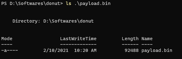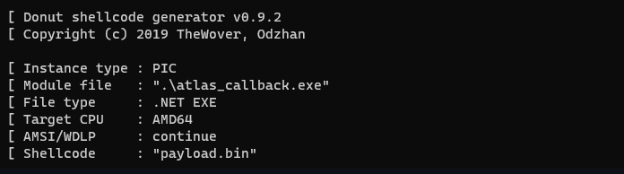 .\donut.exe -f .\atlas_callback.exe -c Atlas.Program -m Main -a 2