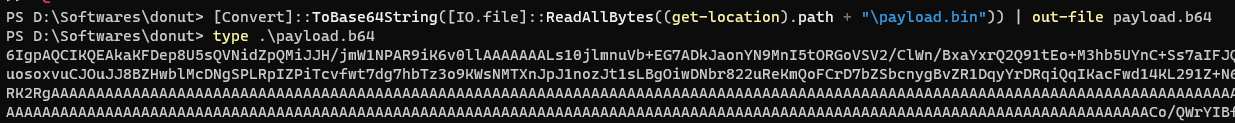 [Convert]::ToBase64String([IO.file]::ReadAllBytes((get-location).path + "\payload.bin")) | out-file payload.b64